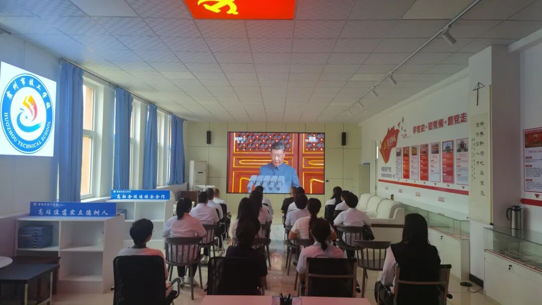 当天上午,全体学生及教职工齐聚操场,在大屏幕下观看阅兵式。与此同时,全体党员在党建活动室集中观看,出租汽车驾驶员继续教育培训班学员在四楼会议室集中观看,大家怀着崇敬的心情,等待阅兵式的开始。